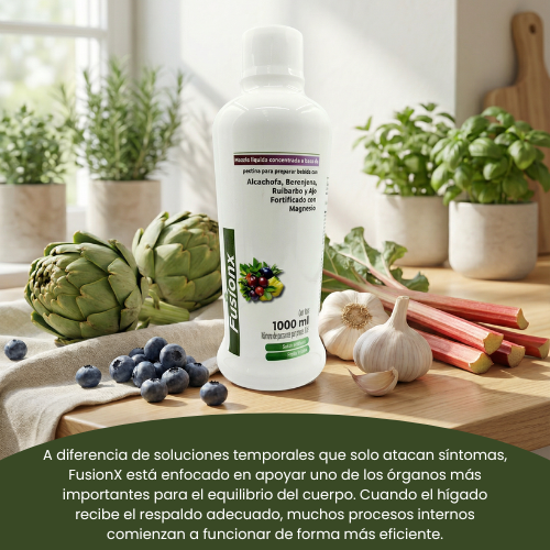FusionX es un suplemento desarrollado para apoyar el cuidado diario del hígado, ayudando a que tu cuerpo procese mejor las grasas y la energía. Su fórmula combina ingredientes de origen natural pensados para integrarse fácilmente en tu rutina, sin ser invasivos y sin generar dependencia.
