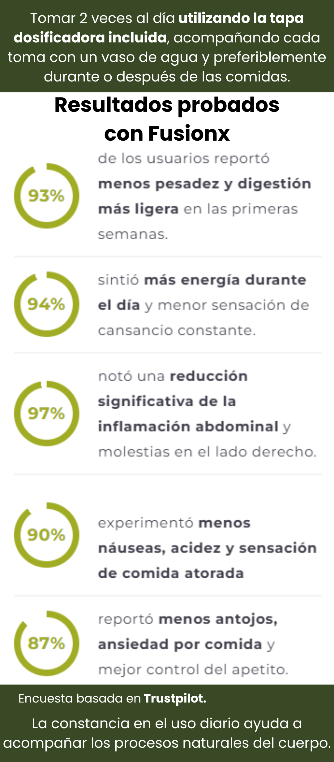 Los resultados pueden variar según cada persona, sus hábitos y su estilo de vida. FusionX no ofrece resultados inmediatos, sino un apoyo progresivo con el uso constante.